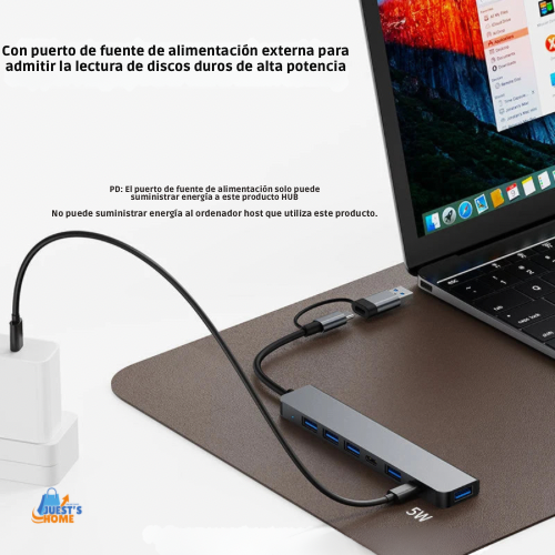Hub USB-C Multipuerto 7 en 1 de Aluminio – 4 USB 2.0, 1 USB 3.0 y 2 Puertos Type-C